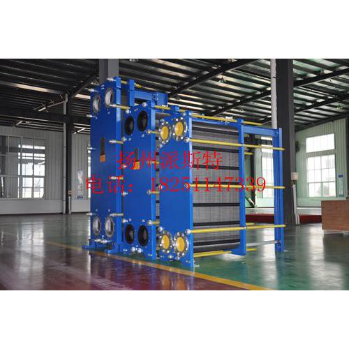 派斯特板式換熱器是由一組波紋金屬板組成,板上有孔,供傳熱的兩種液體通過。金屬板片安裝在一個側面有固定板和活動壓緊板的框架內,并用夾緊螺栓夾緊。板片上裝有密封墊片,將液體通道密封,并且引導流體交替地流至各自的通道內。液體的流量、物理性質、壓力降和溫度差決定了板片的數量尺寸,液體的化學性能、腐蝕特性決定了板片及膠墊的材質,不同的波紋板結構設計不公提高了湍流程度,并且形成許多支撐點,足以承受介質間的壓力差。