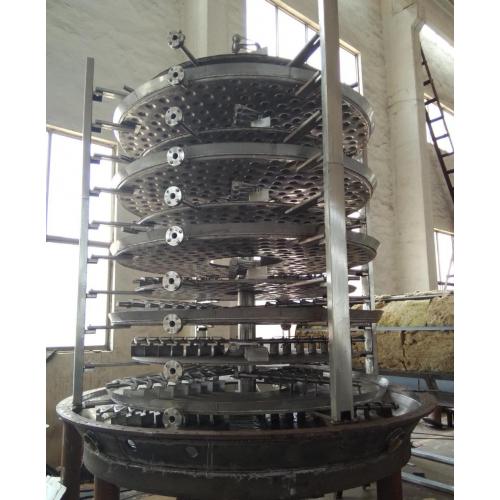 濕物料自加料器連續(xù)地加到干燥器上部***層干燥盤上,帶有耙葉的耙臂作回轉(zhuǎn)運(yùn)動使耙臂作回轉(zhuǎn)運(yùn)動使耙葉連續(xù)地翻抄物料。物料沿指數(shù)螺旋線流過干燥盤表面,在小干燥盤上的物料被移送到外緣,并在外緣落到下方的大干燥盤外緣,在大干盤上物料向里移動并從中間落料口落如下一層小干燥盤中。大小干燥盤上下交替排列,物料得以連續(xù)地流過整個(gè)干燥器。中空的干燥盤內(nèi)通入加熱介質(zhì),加熱介質(zhì)形式有飽和蒸汽、熱水和導(dǎo)熱油,加熱介質(zhì)由干燥盤的一端進(jìn)入,從另一端導(dǎo)出。已干物料從***后一層干燥盤落到殼體的底層,***后被耙葉移送到出料口排出。濕份從物料中逸出,由設(shè)在頂蓋上的排濕口排出,真空型盤式干燥器的濕氣由設(shè)在頂蓋上的真空泵口排出。從底層排出的干物料可直接包裝。通過配加翅片加熱器、溶劑回收冷凝器、袋式除塵器、干料返混機(jī)構(gòu)、引風(fēng)機(jī)等輔機(jī),可提高其干燥的生產(chǎn)能力,干燥膏糊狀和熱敏性物 料,可方便地回收溶劑,并能進(jìn)行熱解和反應(yīng)操作。
